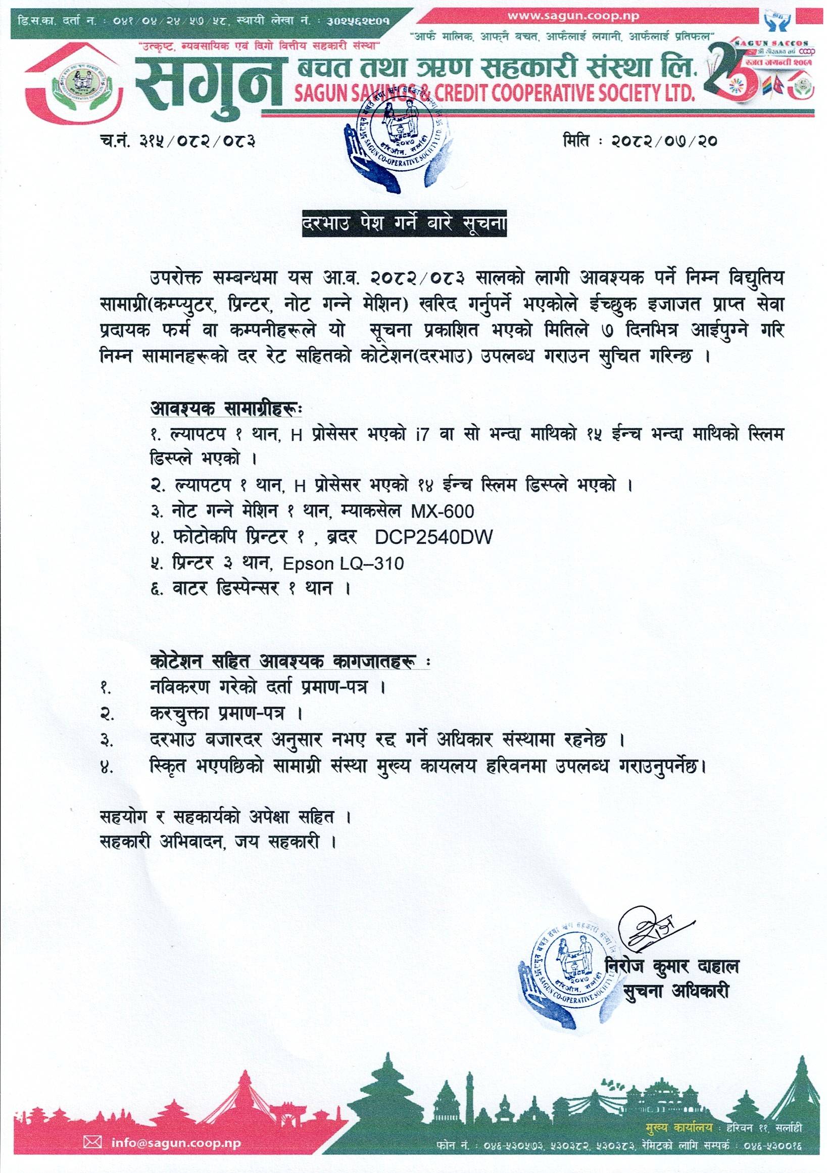 विद्युुतिय सामाग्रीको कोटशन माग बारे ।
